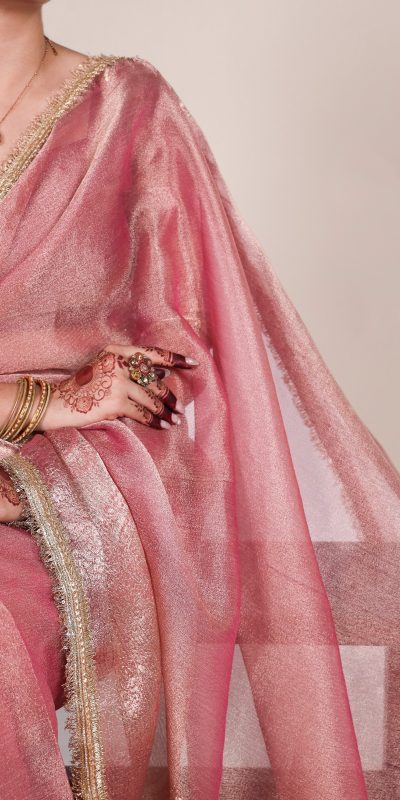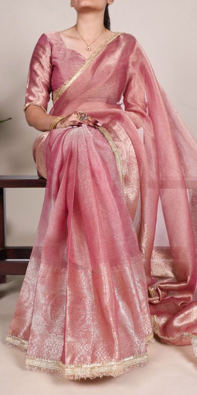 Attractive Pink Color Tissue Shimmer Zari Weaving Work Saree