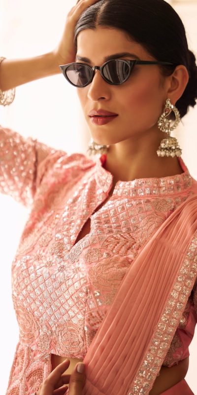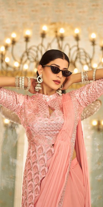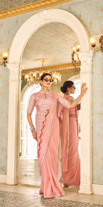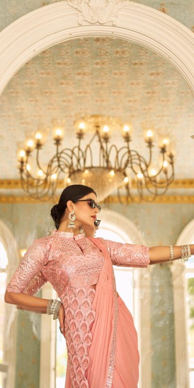 Fantastic Peach Color Chinon Embroidery Work Lace Border Saree