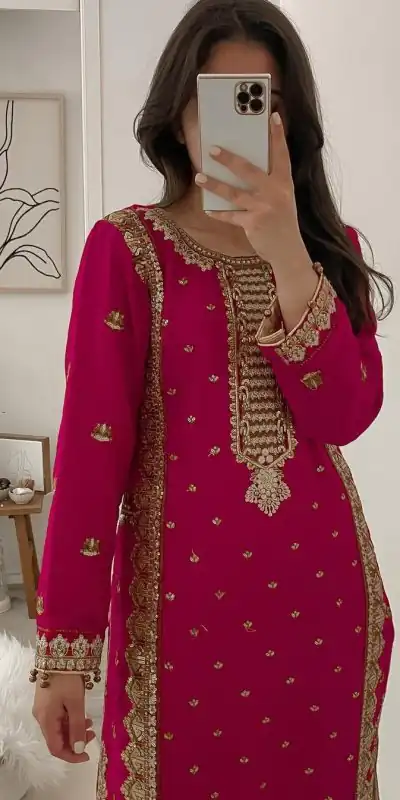 | Fabrics | Top : Faux Georgette Top ; Length : 38 Inch Inner : Micro Cotton Work :Sequence Embroidery Work Size : 42 Xl Free Size Type : Full-Stitched Palazzo; Fabric : Faux Georgette With Ruffle Dupatta : Georgette With Embroidery Sequence Work Dupatta Length : 2.10 mtr with lace border Work : Georgette |