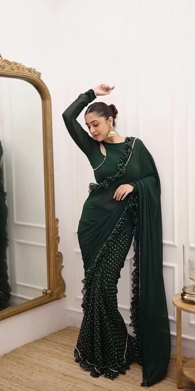 Amazing Black Color Faux Georgette Digital Print With Ruffle And Fancy Lace Saree