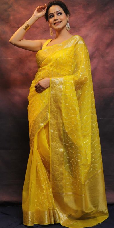215 reviews for Artful Yellow Nylon Organza Jacquard Multi Embroidered Saree