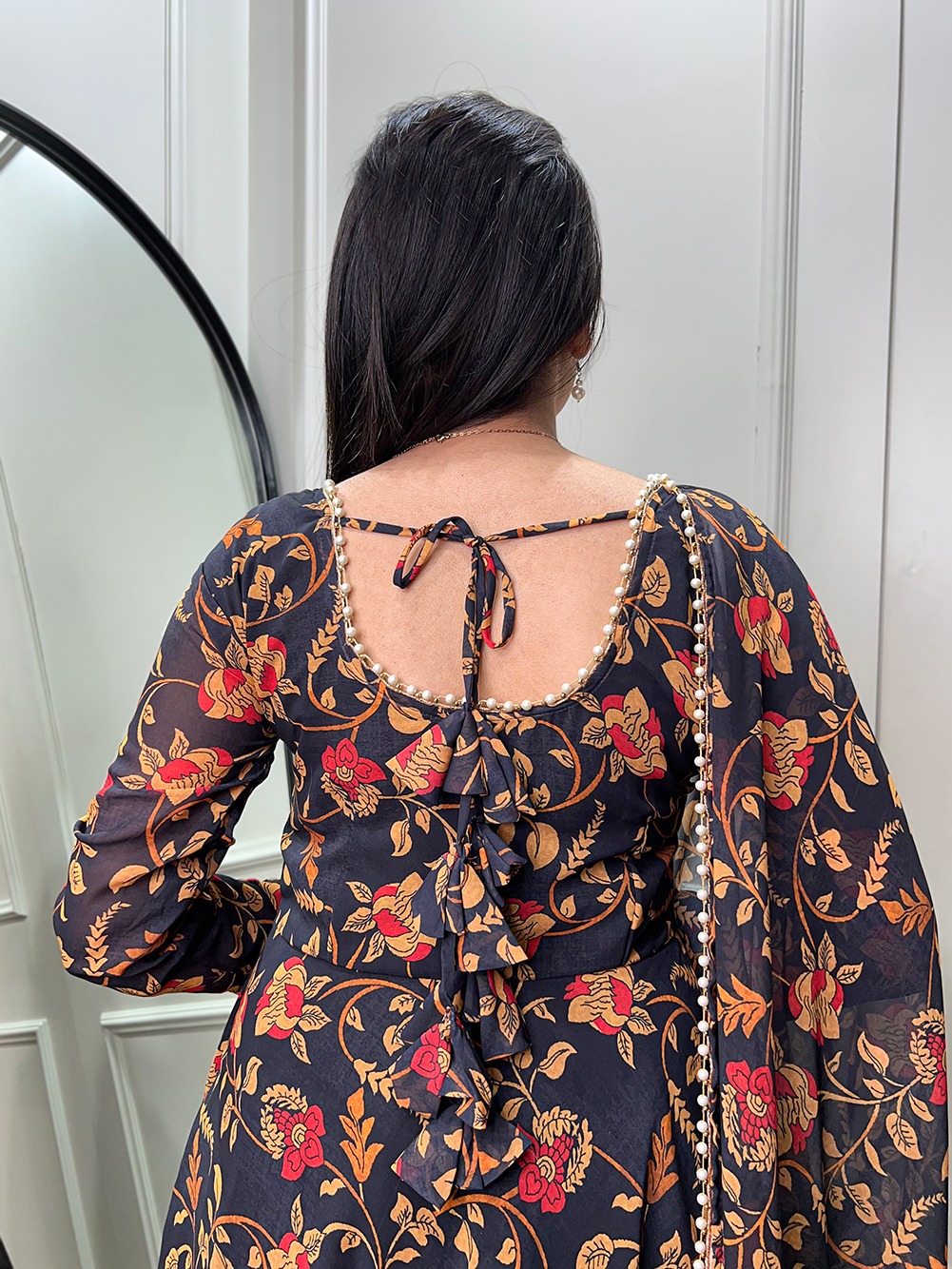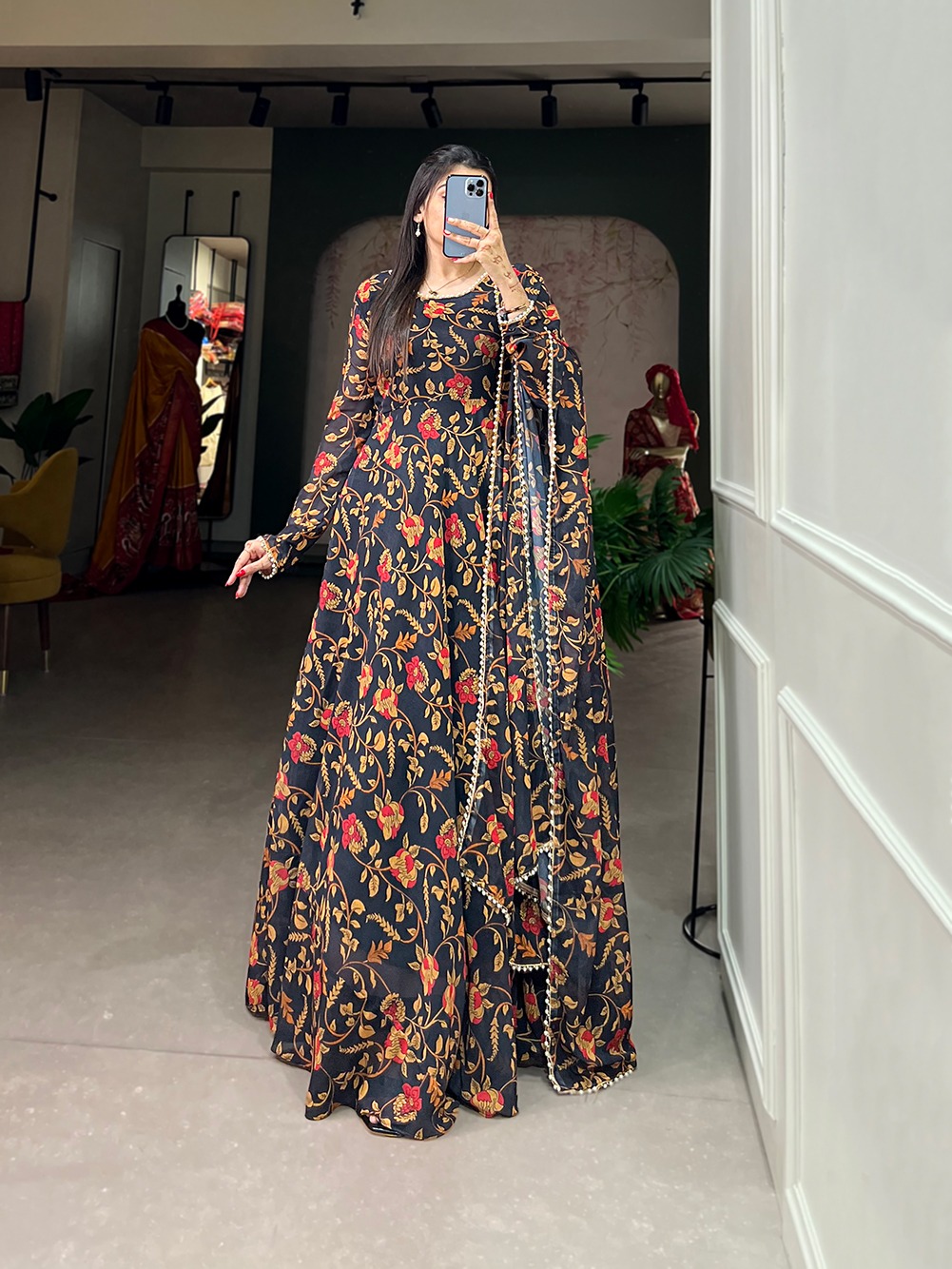 Beautiful Black Color Georgette Floral Printed Gown With Pearl Lace Border Dupatta