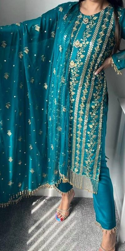 | Fabrics | Long Top Fabric :- Heavy Faux Georgette Fabric With Heavy Embroidery 9mm Sequence Work With Moti Lathan Less . Fully Sleeve’s Long Top inner :- Heavy Micro Cotton Long Top Length :- 46-47Inch Long Top Size :- Free Size Semi Pant Fabric :- Micro Cotton With Ready-Made Moti Latakian Less . Pant Inner :- Heavy Micro Cotton Pant Length :- 40-42 Inch ( Fully Stitched) Dupatta :- Heavy Faux Georgette Material With Heavy Embroidery 9mm Sequence Work Cut Work Less Border |