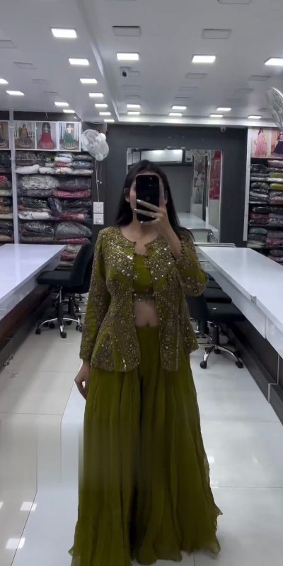 | Fabrics | TopFoix georgette Inner : Micro Work. : thread with Sequence Stich. : Unstitch Up to 42 Foix georgette Work. : thread with Sequence with potali Stich : full Stich up to 42 with elastic Palazzo: Foix Georgette Inner. :- micro Work. :- full stich Up to 44 with elastic |
