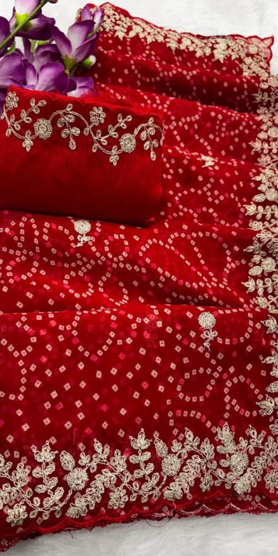 Beautiful Red Color Georgette Bandhni Print With Sober Pita Work Embroidery Saree