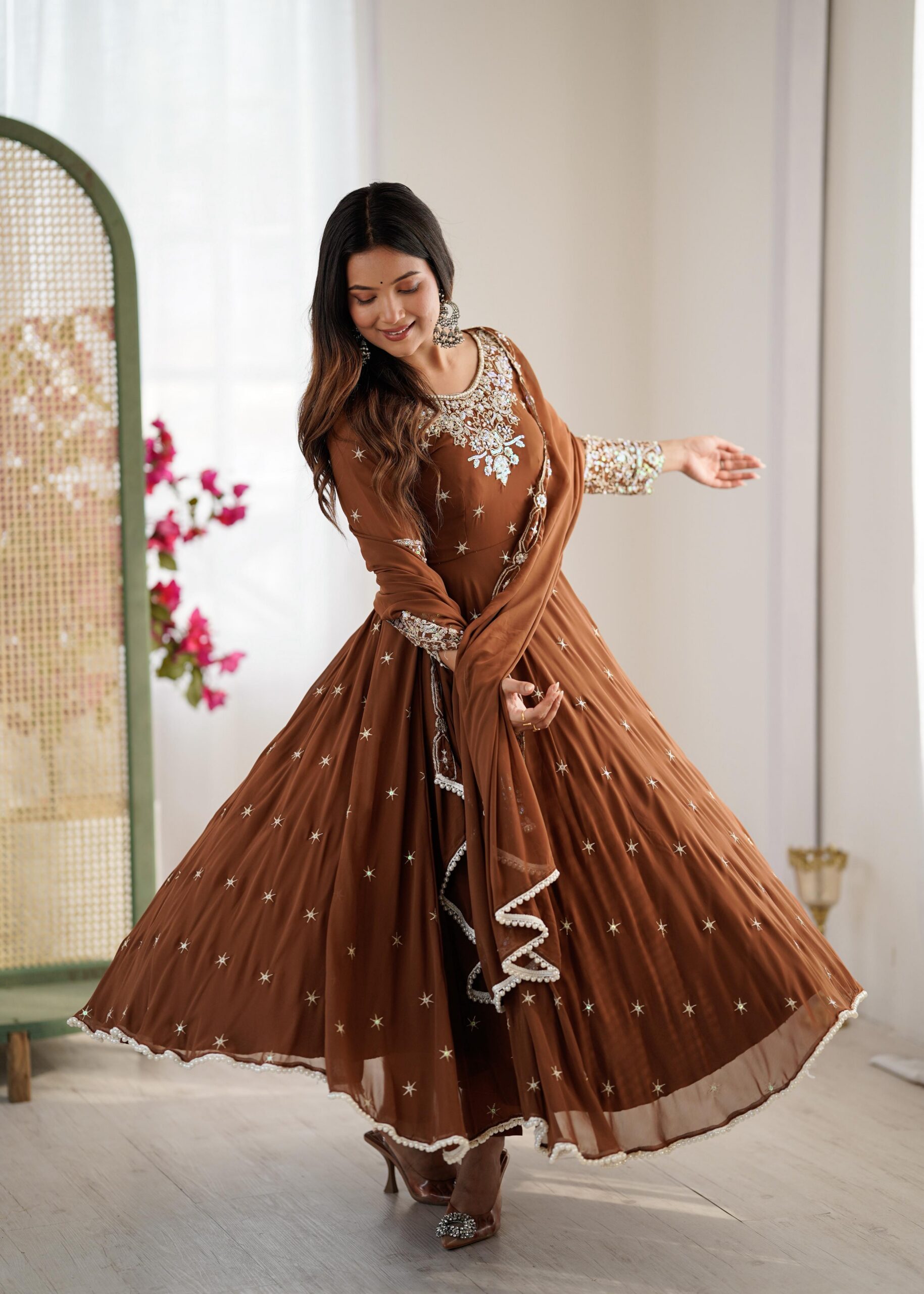 ZF 5012 Brown Blooming Faux Gown with Embroidery Work. Wedding, Party, Festive, Events Grab it for ₹2149. Delivery 4-6 Working Days. Shop now. | Lehenga, Bollywood Lehenga, Creative Lehenga, Designer Lehenga, Embroidered Lehenga, Party Wear Lehenga