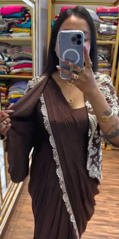 Brown Faux Georgette Embroidery Work Saree