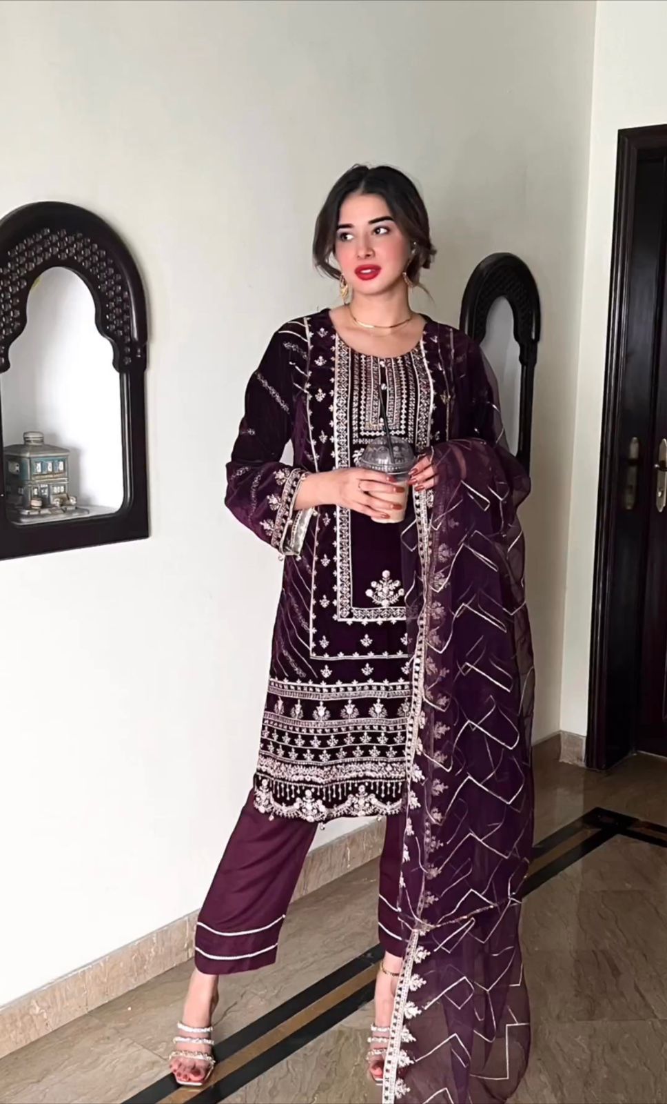 | Fabrics | Top : Viscos velvet Top Length : 40-41 Inches Inner : Micro Cotton Work :Heavy Viscose Velvet Embroidery Work With Sleeves Size : Free Size Type : Semi Stitched Pent Fabric :Viscos velvet Stitch with elastic Dupatta : Heavy Net with Embroidery Work With Heavy Embroidery lace border |