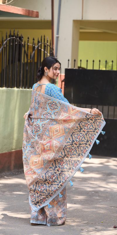 Classic Grey Color Linen Beautiful Digital Printed Work Saree