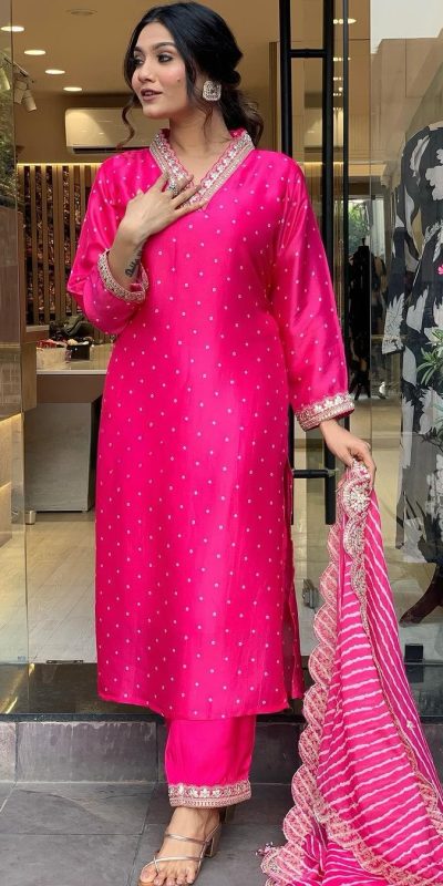 | Fabrics | Top Fabric :Heavy Modal Silk With Embroidery Sequence Work With Sleeve Top Length: 44-45 Inch Inner : Micro Cotton Size : Free Size Type : Semi Stitched Bottom Fabric :Heavy Modal Silk With Embroidery Sequence Work With Elastic Bottom Length : 39 Inch Dupatta Fabric: Pur Chinon Silk With Digital Print With Embroidery Sequence Work With Cutwork Dupatta Length: 2.20 Mtr |