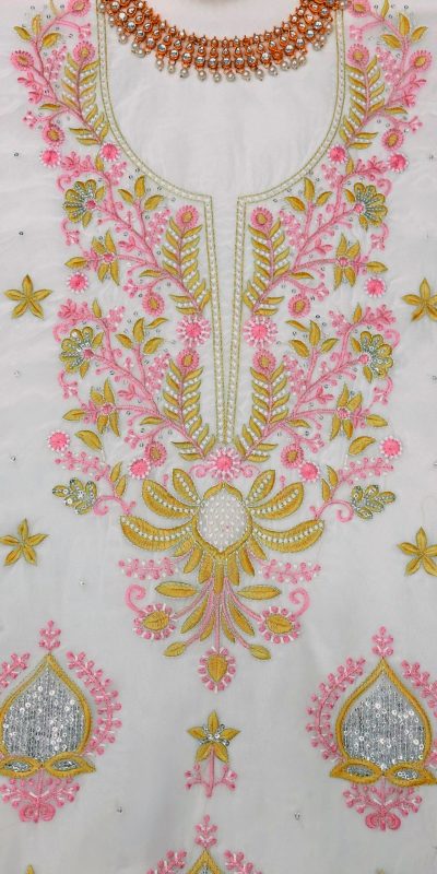 | Fabrics | Top :Tabby organza silk Work : thread with Sequence Inner. : micro Stitching type : Unstitch (only fabric 1.60m) with sleeve (0.45m )