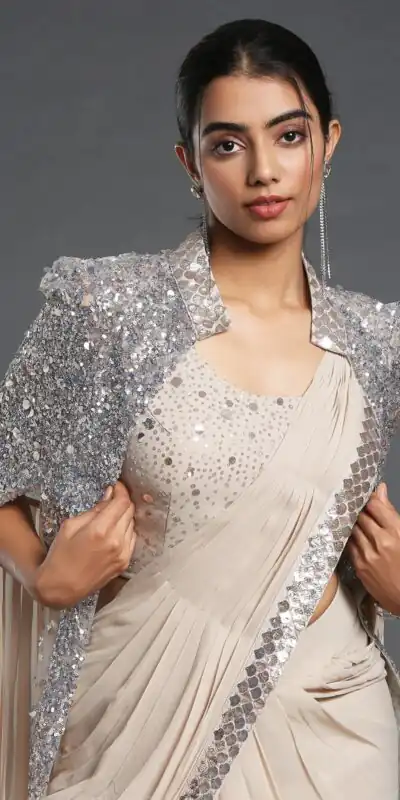 Satin blend Indian saree ka shine moderate hai; na zyada glossy, na dull, simple dinner ya small gathering ke liye theek choice hai.