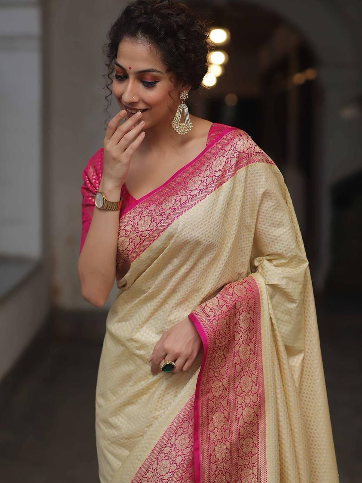 Cream Soft Lichi Silk Jacquard Rich Pallu Saree