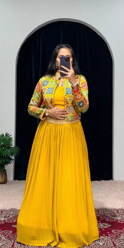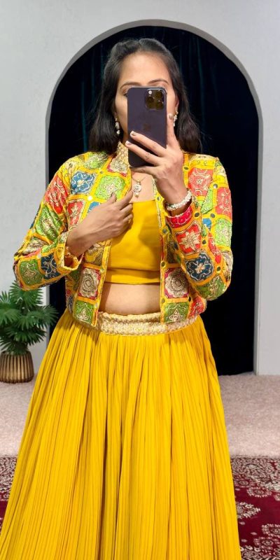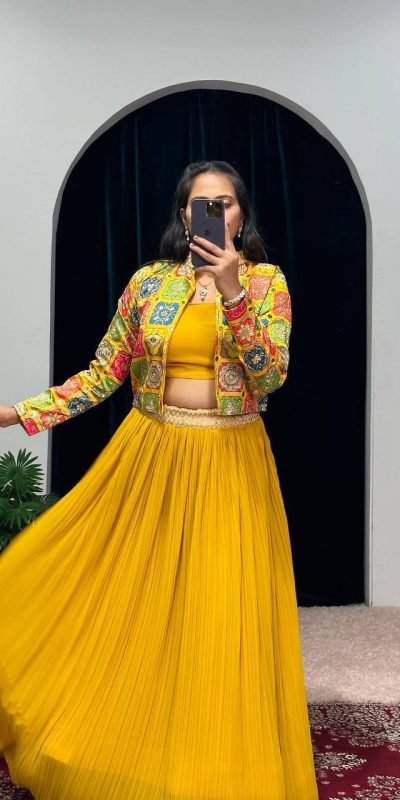 Cute Yellow Color Georgette Zari Kashmiri Mirror Lehenga Choli