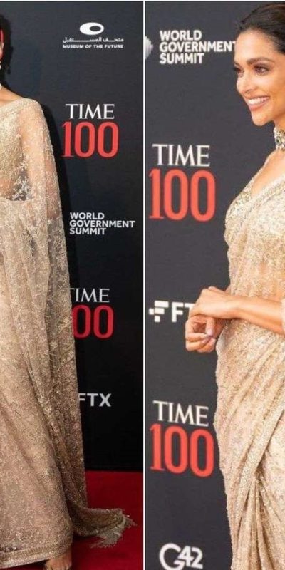 Deepika Padukone Golden Nylon Butterfly Net Dori Work Saree