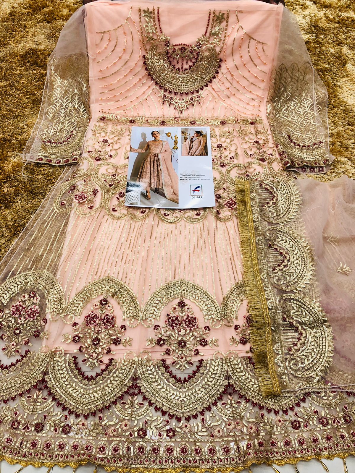 | Fabrics | Fabric Details :- Top :- Heavy Net with sequence Embroidery Sleeves :- Heavy Net with sequence Embroidery Inner :- Santoon Bottom :- Santoon Dupatta :- Net with sequence Embroidery Length :- Max up to 46 Size :- Free Size Type :- Material Weight :- 1.5 kg |