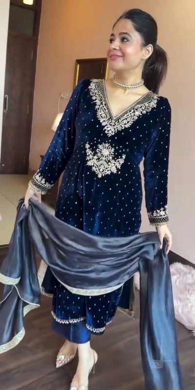 Everlasting Navy Blue Color Viscos Velvet Thread Work Salwar Suit