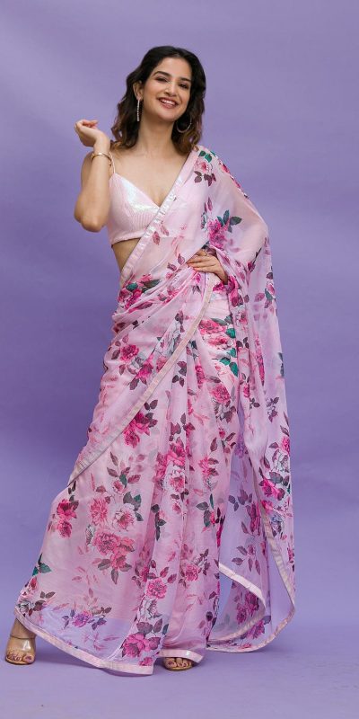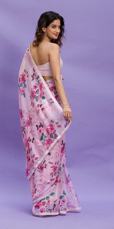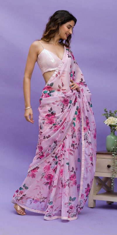 Fancy Pink Floral Digital Printed Georgette Lace Border Saree