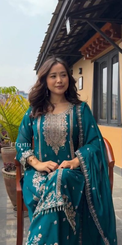 | Fabrics | kurti fabric : cpure Chinon with embroidery work with fancy moti lace Inner fabric : butter crepe Length: 44-46 inches Dupatta : heavy pure Chinon silk with embroidered sequence dupatta length : 2.2mtr type: full stitched free Size Semi Stitched Bottom : heavy pure Chinon silk length : 39-40) fully stitched with inner sizes available: size : Fully stitched with inner |