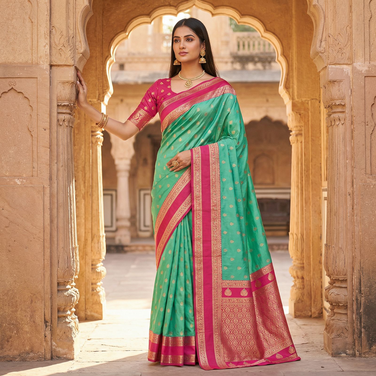 Blouse :- Contrast Matching silk weaving blouse piece with zari motifs and coordinated border for a complete traditional look.