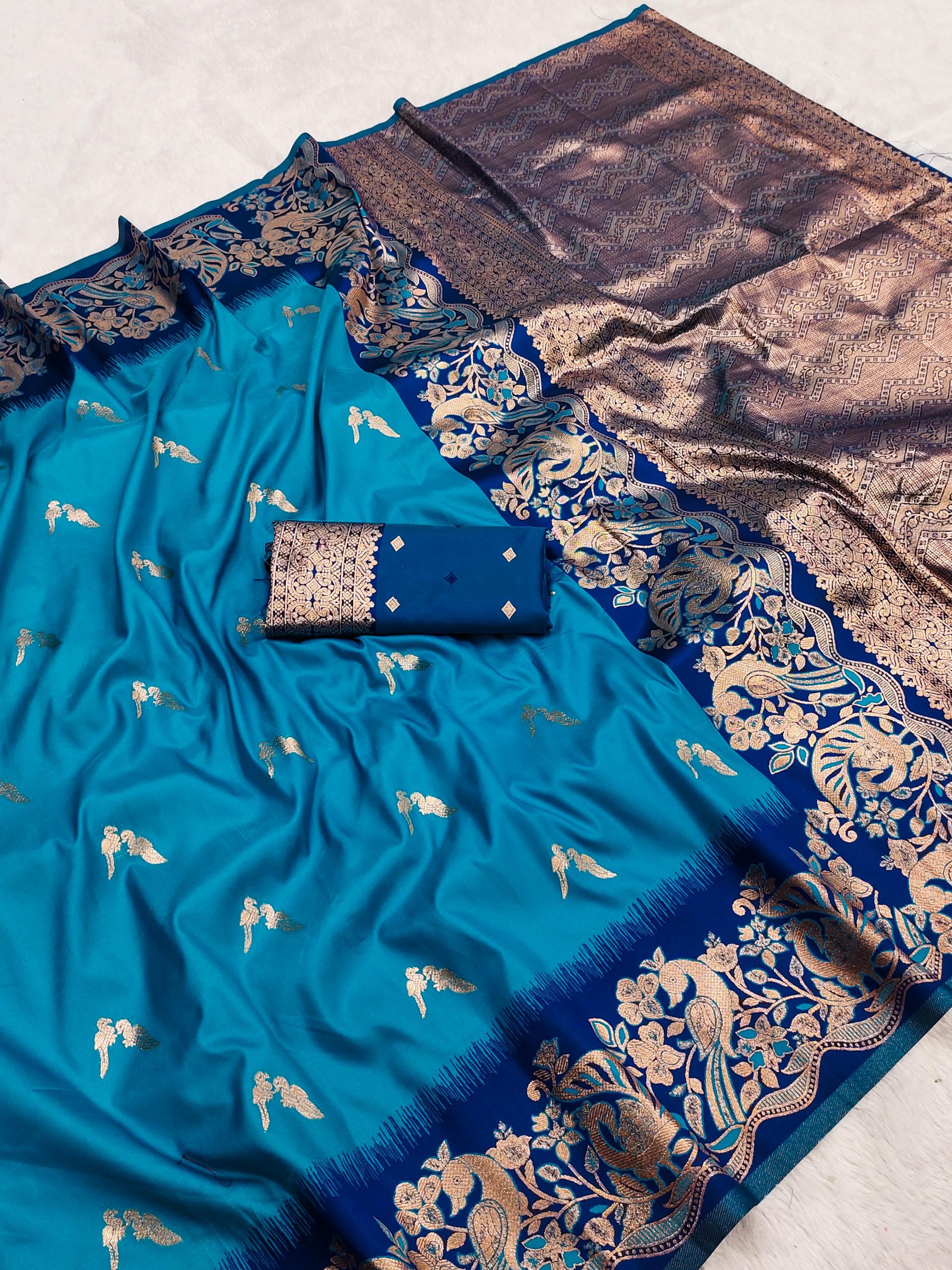 Saree :- Soft And pure banarasi silk saree with self weaving design all over the saree & zari weaving Contrast Matching Rich pallu with zari weaving unique border & heavy Rich Pallu.