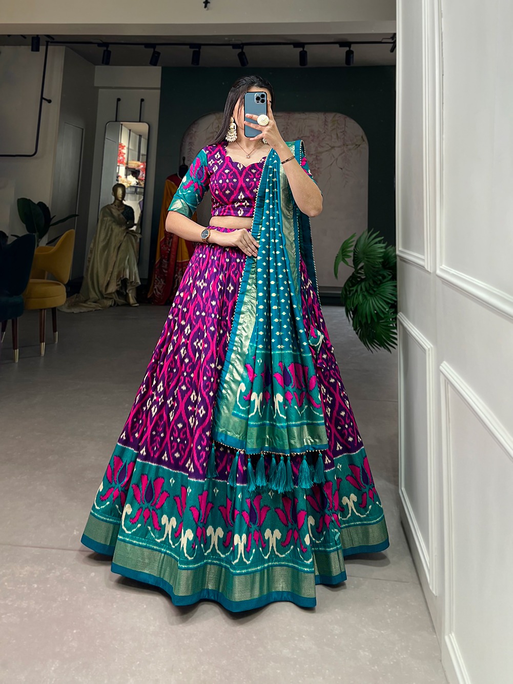 Glamorous Purple Color Tussar Silk Drawstring & Printed With Foil Print & Heavy Tassels Lehenga Choli