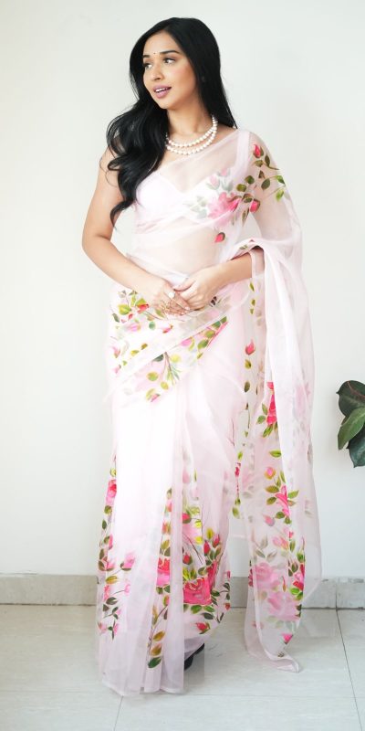 | Fabrics | Fabric : pure soft Organza Work : Digital Print design All over Blouse :Beautiful same Blouse piece |