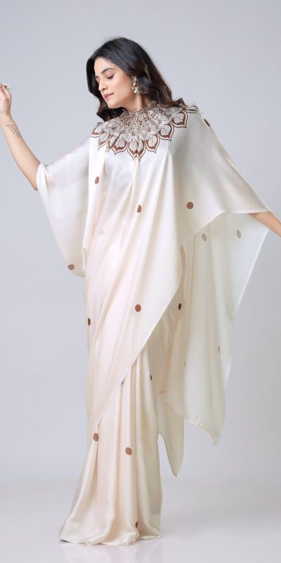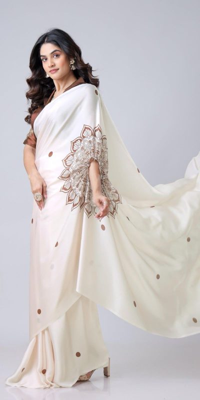 Glowing Cream Color Japan Satin Digital Print Work Saree