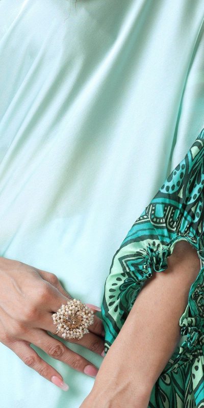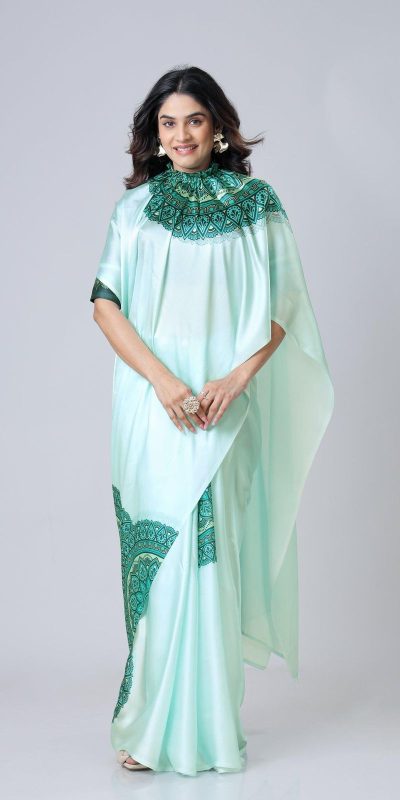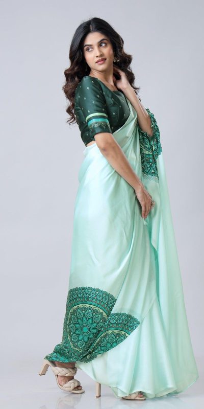 Glowing Sea Green Color Japan Satin Digital Print Work Saree