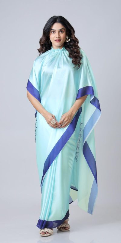 Glowing Sky Blue Color Japan Satin Digital Print Work Saree