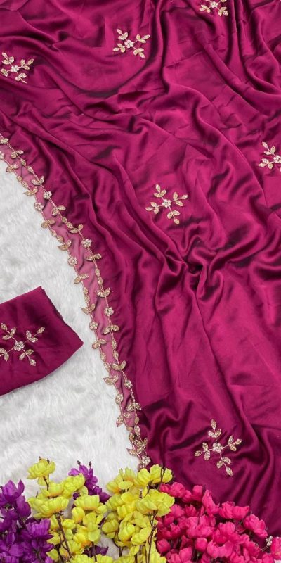 Gorgeous Rani Pink Color Rangoli Silk Handwork Cutwork Pearl Saree