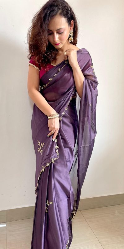 Gorgeous Violet Color Rangoli Silk Handwork Cutwork Pearl Saree