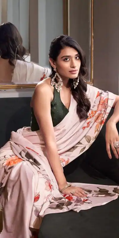 Fabrics Saree Fabric : Satin Silk Saree Work : Printed Saree Length : 5.5 meterBlouse(Unstitched) Blouse Fabric : Moonga Silk Blouse Work : Hotfix Blouse Length : 1 meter