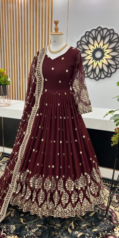ZF 359 Dark Brown Color Georgette Embroidery Sequence Work Gown Casual, Wedding, Party, Festive, Events Etc. Expected Delivery 4-6 Working Days @1999/-
