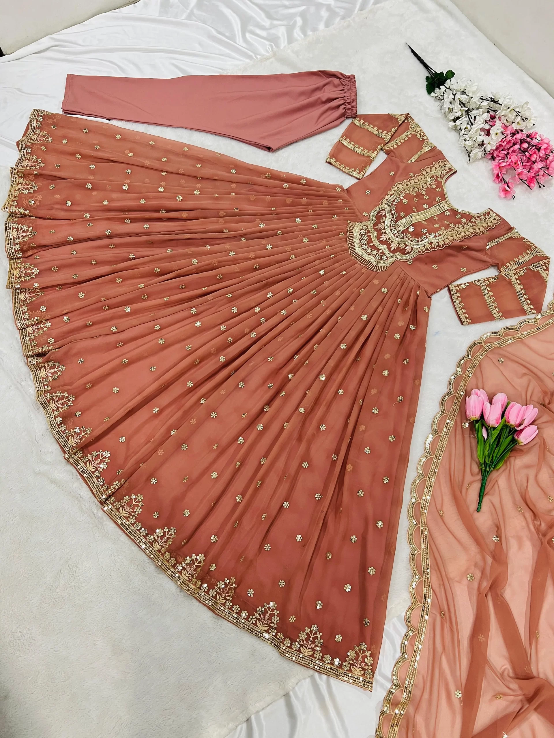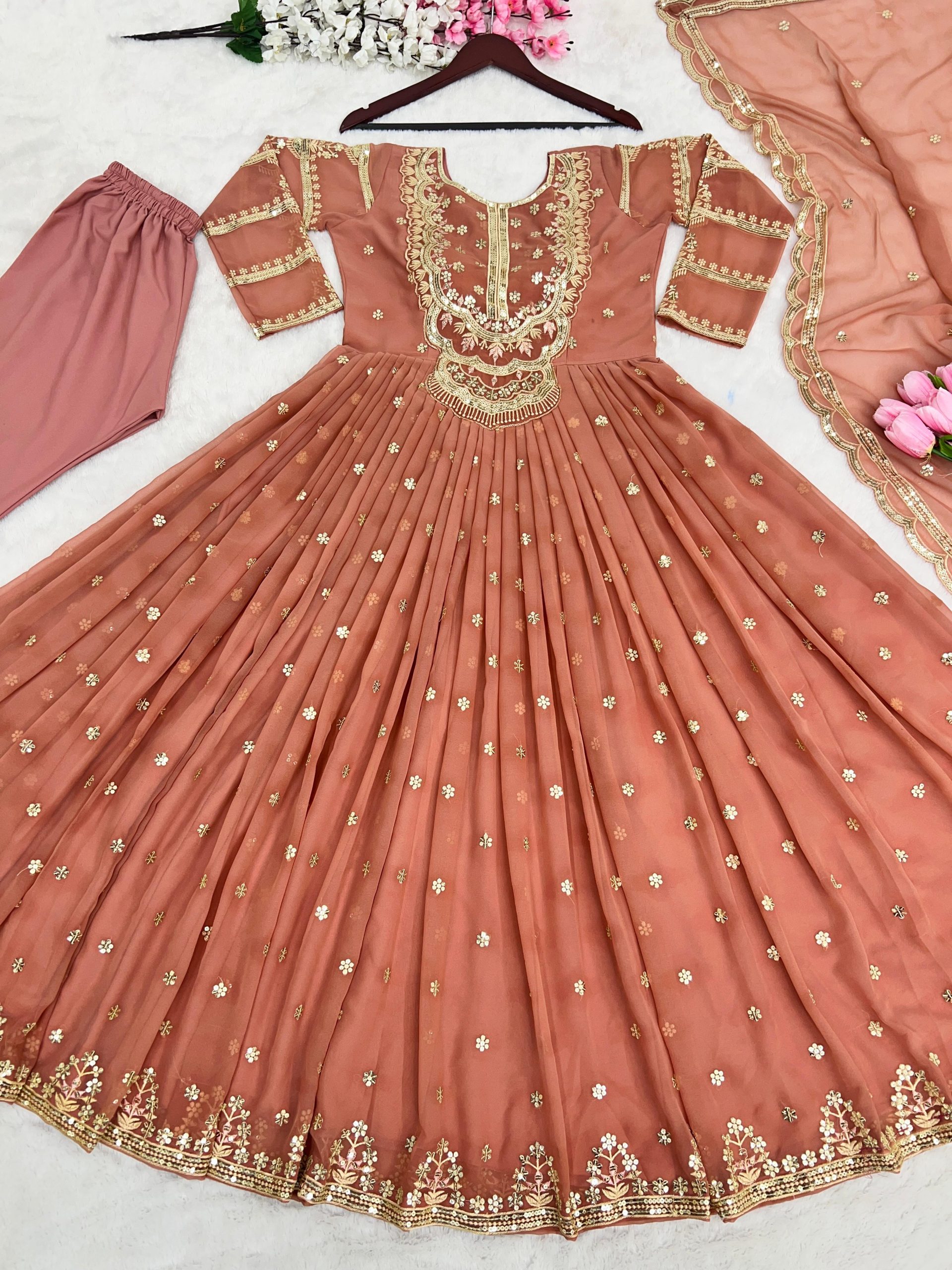| ? Fabrics? | Gown : Faux Georgette Gown Length :50-51 Inches Inner : Micro Cotton Work :Sequence Embroidery Work Size : Up To 42 Xl Free Size Type : Full-Stitched Gown Flair : 3 M Bottom Fabric : Micro Cotton (Full Stitched) Dupatta : Georgette With Embroidery Sequence Work Dupatta Length : 2.10 mtr Work : Georgette |