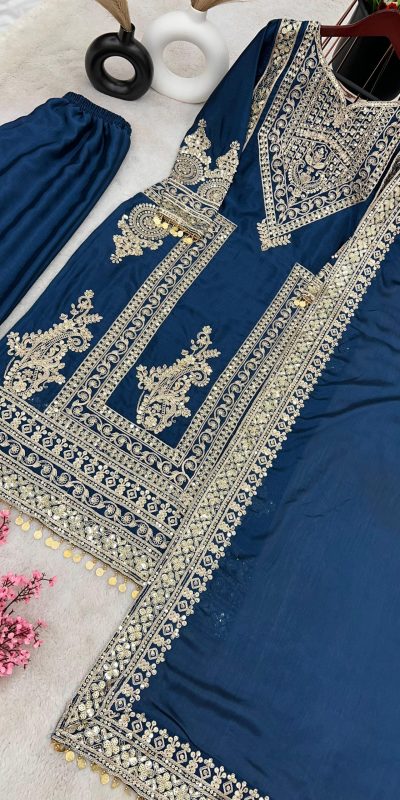 Grand Blue Color Chinnon Silk Embroidery Coding Salwar Suit