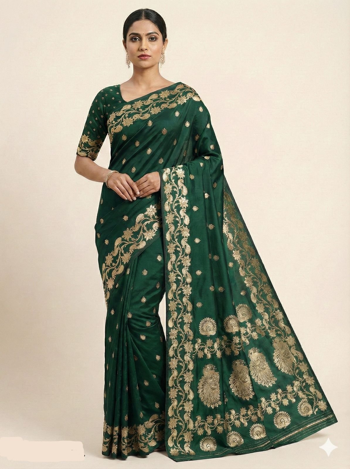 Blouse :- Matching soft pure silk weaving blouse piece with subtle zari motifs and a coordinated rich border for a complete graceful look.