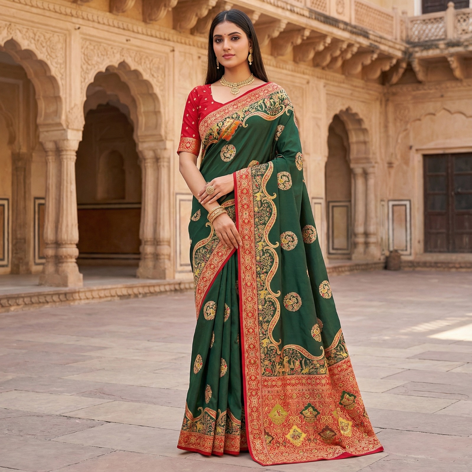 Green Pashmina Silk Woven Lace Border Saree