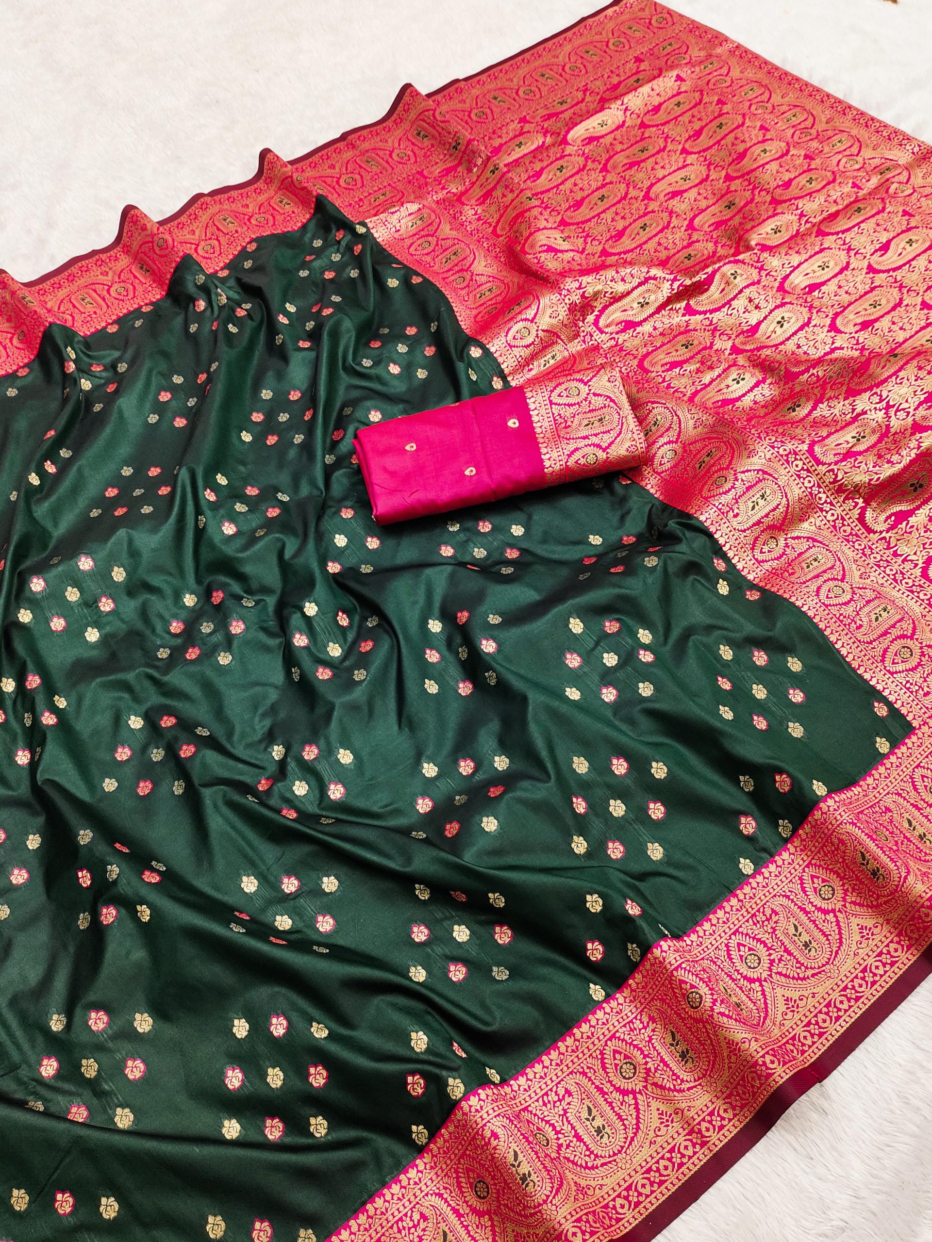 Saree :- Rich Banarasi silk saree with golden butta motifs, complemented by an intricate and gold zari border and pallu featuring paisley designs.