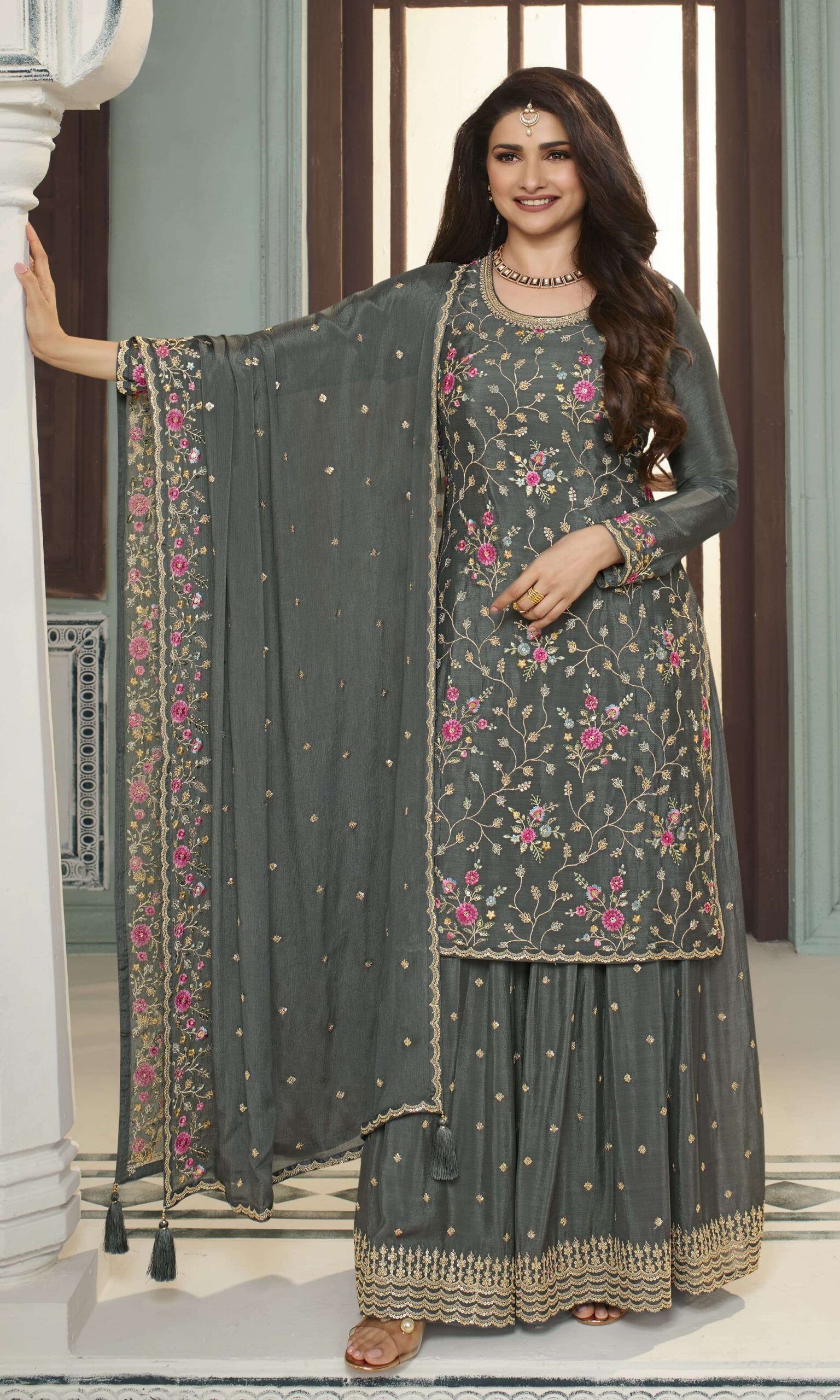 Grey Chinon Multi Work Salwar Suit