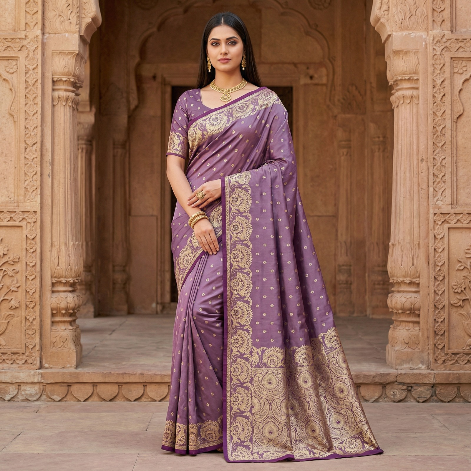 Saree :- a rich mauve-rose shade, enhanced with small woven gold butta motifs across the drape. The saree features a woven zari pallu with paisley and floral detailing.