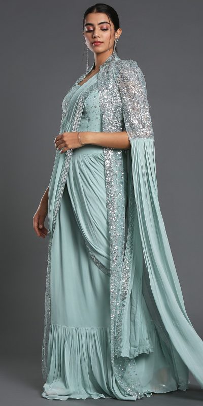 Luminous Cement Color Georgette Sequence Beautiful Frill Saree