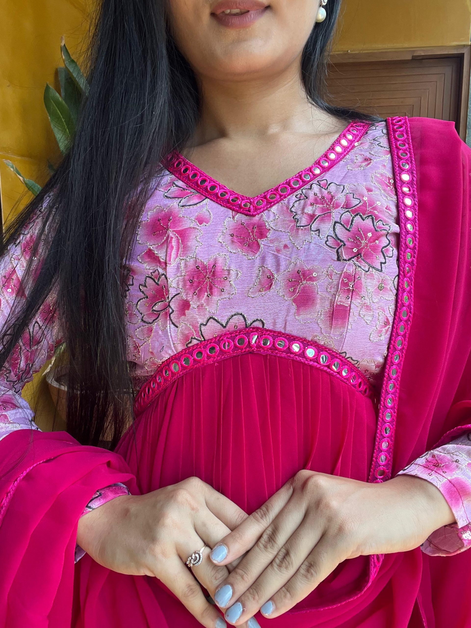 Luminous Pink Color Fox Georgette Position Print Work Gown