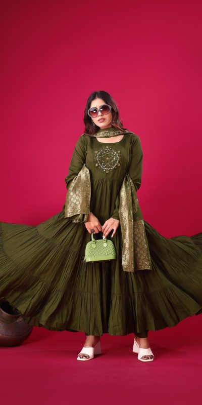ZSR 3107 Mehandi Color Roman Silk With Embroidery Sequence Work Anarkali Gown Wedding Party, Festive, Events Etc.4-6 Working Days@1799/- only