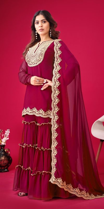 | Fabrics | Top Fabric :Blooming Faux Georgette With Heavy Embroidery 3mm Sequence Thread Work With Full Sleeve Top Inner : Heavy Micro Cotton Top Size : Free Size Fully Stitched Ready To Wear Top Length : 31-32 inchPalazzo Fabrics : Blooming Faux Georgette With Elastic Full stitched Palazzo inner : Heavy Micro Cotton Length: 40-41 Inch fully stitched Dupatta Fabric : Blooming Faux Georgette With Embroidery 3mm Sequence Work With Lace Border |