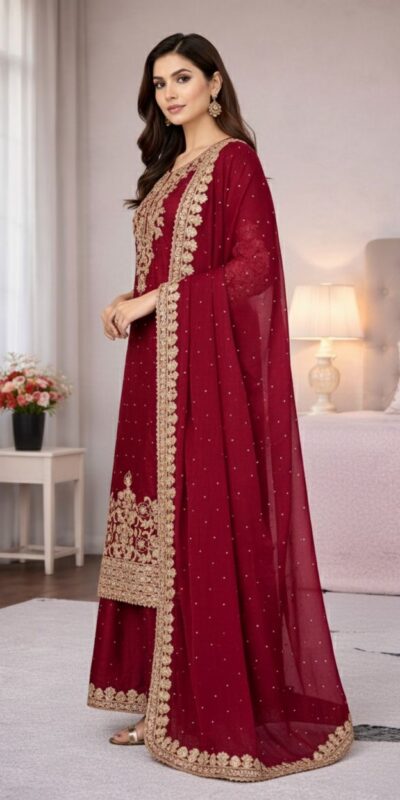 Maroon Organza Silk Embroidery Work Salwar Suit