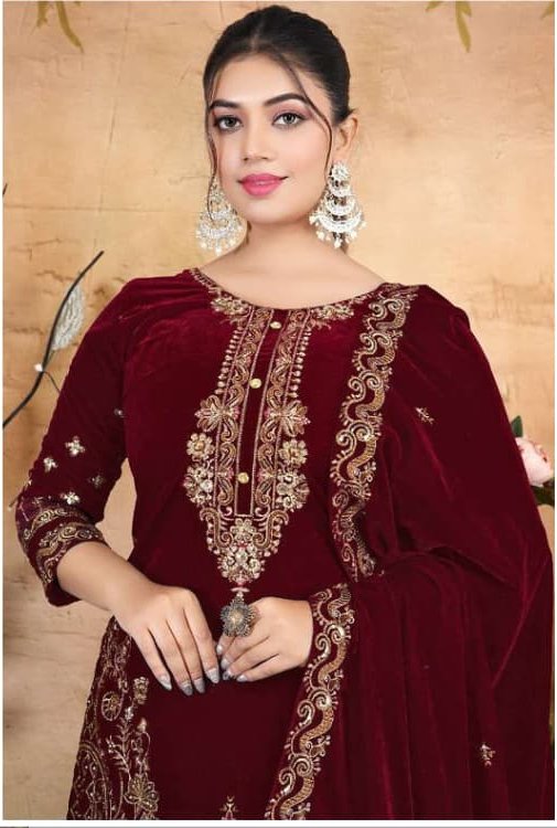 Maroon Velvet Embroidery Lace Work Salwar Suit