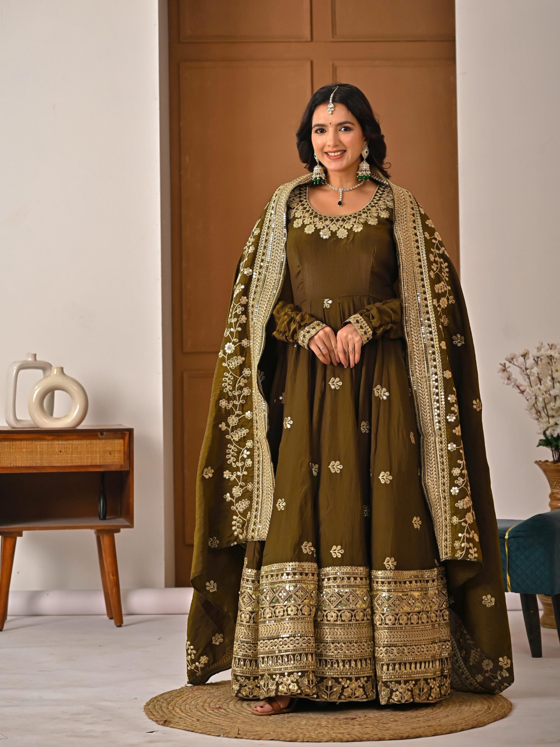 Anarkali Fabric : Heavy NC Vichitra Silk With 5 mm Sequence And Embroidery Work ( Fully Sleeves )Anarkali Flair: 4 mtr (With Cancan Patta)