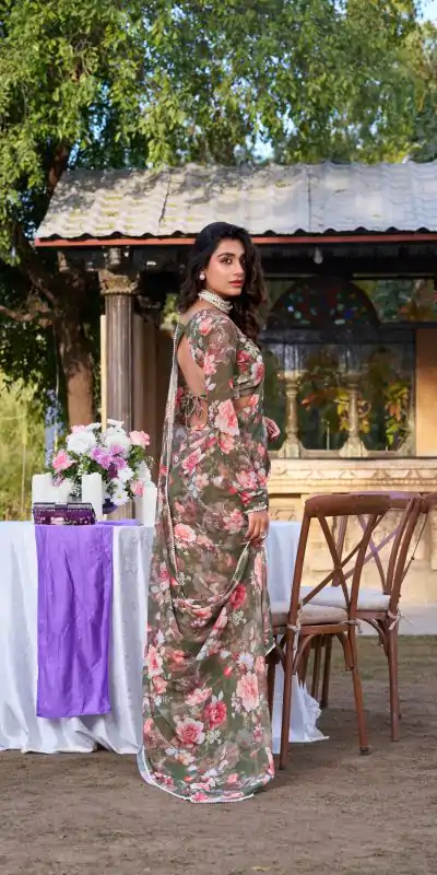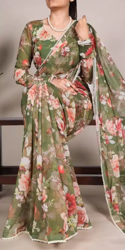 Mehandi Weightless Printed Pearl Saree - Image 4