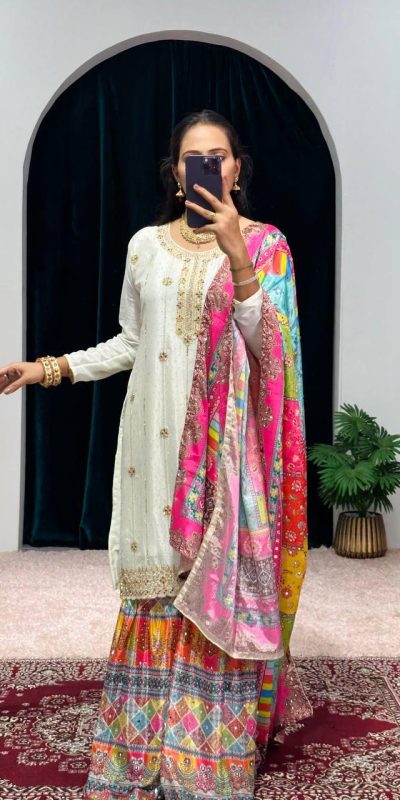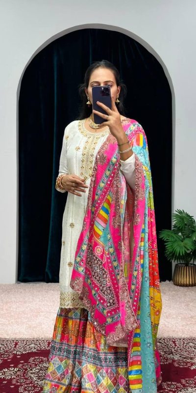 | Fabrics | Top : Chinon Work:- Embroidery Work Length:- 20 Inch, Height:- 40 Inch Inner :- Micron Pant: Digital Print Chinon Height :- 40 Inch Dupatta: Chinon Work :- Hand Work & Real Mirror And Stone Work Lenght :- 2.5 Meter |